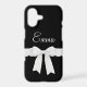 An elegant white bow and ribbon set against a striking black background, featuring a personalized name.