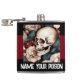 This spooky flask has a black and maroon striped background, with an image of a skull and flowers, on the front. Underneath the image is the text “NAME YOUR POISON”.