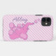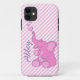 Cute elephant blowing heart shaped bubbles on a candy pink strip pattern. Cute girls iphone 5 case, personalise with your name. This example reads: Abbey. Uniquely designed and illustrated by Sarah Trett.