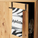 An stylish zebra print kitchen towel in black & white with a silver-design nameplate, personalised with your name or text. (The nameplate is a printed illustration. Not reflective or real silver.)