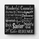 The Bible has many names of God to remind us who He is to us. A few of them are artfully written on this plaque with easel. The names are "Wonderful Counsellor, Alpha & Omega, Advocate, Cornerstone, Deliverer, Light of the World, Immanuel, Messiah, Good Shepherd, Rock, Saviour, Mighty God, Good Father, Redeemer".