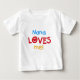 Nana Loves Me T-shirts, bodysuits, sleeveless dresses, ruffle shirts, ruffle dresses, hats, organic bodysuits, football bodysuits, tutu bodysuits, raglan T-shirts, dark T-shirts, sweatshirts, pullover hoodies, and more for babies, kids, and toddlers with text and heart design of red, blue, and gold that reads Nana Loves Me!
