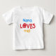 Nana Loves Me T-shirts, cards, stickers, bodysuits bags, and more with colourful red, yellow, and blue text and heart design. These Nana Loves me apparel and gift items will make nana smile!