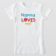 Nanna Loves Me T-shirts, cards, stickers, bodysuits bags, and more with colourful red, yellow, and blue text and heart design. These Nanna Loves me apparel and gift items will make nanna smile!