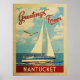 This Greetings From Nantucket Massachusetts vintage travel nautical design features a boat sailing on the water with seagulls and a blue sky filled with gorgeous puffy white clouds.