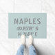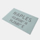 Stylish front doormat with Naples Italy city latitude and longitude map coordinates in modern grey industrial font on light blue background