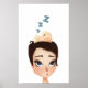Artistis poster with a girl and a bird sleeping on her head. A beautiful girl with a short haircut looking up at a yellow birdie taking a nap. Cute children's book illustration, print for kids.