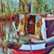 A pretty art design of a narrowboat moored in a peaceful part of the canal.