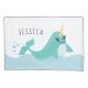 Add a cute arctic touch to your child's bedroom decor! The front of this magical design features a happy blue narwhal swimming and splashing in the water. The whale has a yellow tusk and pretty eyelashes. You can personalise it with your choice of name. The back of this design has a pattern of narwhals.