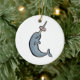 Here we see a cartoon narwhale playing with a pink iced doughnut.
