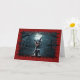 This unique Halloween card features an adorably spooky twist with a small black-and-white dog, possibly a Chihuahua, transformed into a fierce little vampire. The dog has sharp fangs bared in a playful snarl, perfectly capturing the spirit of Halloween. The background is a dark, eerie scene with a full moon, leafless trees, and a haunted house silhouette, adding to the creepy atmosphere. The card is bordered with jagged red edges that resemble torn paper, enhancing the spooky vibe.