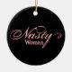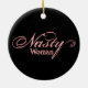 Hillary Clinton for President supporting "Nasty Woman" in cursive and serif lettering, campaign/election gear, on t-shirts, sweats, stickers, buttons, novelty gift memorabilia.
