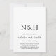 Modern wedding invitation featuring a simple and minimal black and white design with your monogram in a bold font along with your names in an elegant handwriting script.