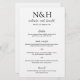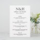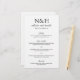 Modern wedding menu featuring a simple and minimal black and white design with your monogram in a bold font along with your names in an elegant handwriting script.