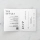 Modern all in one folded wedding invitation featuring a simple and minimal black and white design with your monogram in a bold font along with your names in an elegant handwriting script over your favourite photo. The inside has your additional details and optional QR code on the left side (if you prefer, you may remove the QR code in the design editing tool) and your RSVP card on the right.