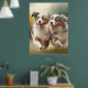 Two beautiful happy, smiling and running Aussie dogs. The Australian Shepherd is a lean tough ranch dog, one of those 'only in America' stories: a European breed perfected in California by way of Australia. As fixtures on the rodeo circuit, Aussies are closely associated with the cowboy life. The Australian Shepherd, the cowboy's herding dog of choice, is a medium-sized worker with a keen, penetrating gaze in the eye. Aussie coats offer different looks, including merle (a mottled pattern with contrasting shades of blue or red). In all ways, they're the picture of rugged and agile movers of stock. Aussies exhibit an irresistible impulse to herd, anything: birds, dogs, kids.
