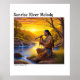 A native American warrior enjoying a peaceful moment playing a flute by a river during a sunrise.