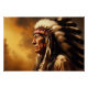 The painting depicts a Native American chief in profile, his face etched with wisdom and experience. He wears a traditional headdress adorned with feathers, beads, and a red band. His long, dark hair flows down his back, and his eyes gaze intently into the distance. The background is a warm, golden sunset sky, suggesting a sense of peace and tranquillity.