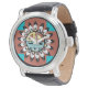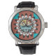 This is a unique watch design in the colours of the Southwest: turquoise, brown, yellow, black and white. The design shows the Four Directions and depicts a feathered mask/shield in the centre.