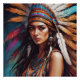 A native american woman with a serious expression wears a vibrant headdress adorned with colourful feathers. Her attire is complemented by layered necklaces and earrings, creating a striking and intricate look.
