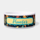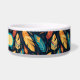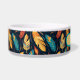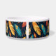 Bright and colourful Southwest, Native American Style pet bowl features turquoise blue, orange, yellow and rust coloured feathers against a black background. In the centre is a peach coloured banner where you personalise with your dogs name.