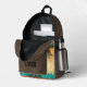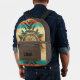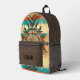 This backpack features a Native American / Southwestern design that looks like a sunburst in tan, turquoise, coral and black. The sides and top of the backpack are a faux suede with stitching on it. A spacious pocket is on the front which is also done in the brown suede and you personalise with your name.