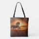 A black horse gallops across a field of tall grass at sunset. A farmhouse is visible in the distance. The scene {LOOKS LIKE IT} is rendered in leather carving, with intricate details and a warm, rustic aesthetic.