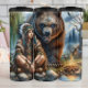 This image portrays a captivating scene near a gently rippling stream in what could be a remote part of New South Wales. A young woman with long, wavy brown hair, adorned in Native inspired attire and a striking feathered headdress with turquoise accents, sits cross-legged on smooth river stones. Behind her stands a massive brown bear with piercing blue eyes and visible teeth. A small campfire flickers nearby, casting a warm glow. In the background, a rustic dwelling is nestled amongst trees, and a couple of deer graze peacefully, evoking the unique wilderness of the forest bush.