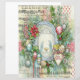 The design showcases a soft watercolor background layered with vintage sheet music and touches of festive polka dots. The central focus is a sweet, tenderly drawn Nativity scene, framed by a delicate, icy blue tinsel wreath.