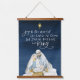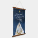 This modern religious Christmas hanging tapestry features a watercolor nativity scene on a navy blue background.