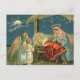 Lovely vintage illustration of baby Jesus born in Bethlehem, surrounded by his mother Mary and two little angel praying.