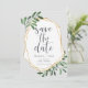 Beautiful green and gold wedding save the date cards feature gray lettering framed by a faux gold geometric border and dark hunter green watercolor foliage, leaves, and white berries on a pale gray background. Personalize with your names, wedding date, and location, and add any additional information, like your wedding website, to the reverse side. A modern choice in a natural color scheme for boho, woodland, or nature themed weddings in any season.