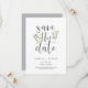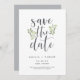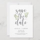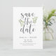Beautiful green and gray wedding save the date cards feature gray lettering accented by delicate light green watercolor foliage, leaves, and white berries. Personalize with your names, wedding date, and location, and any additional information, like your wedding website. A modern choice in a natural color scheme for boho, woodland, or nature themed weddings in any season.