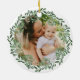 This holiday season, commemorate a special year with this elegant personalized photo Christmas ornament. A wreath of forest green painted watercolor mistletoe frames your family name, the year, and the word "merry" in chic calligraphy script. Add a photo to the reverse side with a matching wreath frame.
