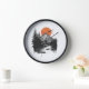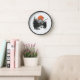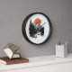 The size of the clock is dramatic and the abstract alcohol ink design is soothing and intricate at the same time. I chose the black frame that adds pop to the blue and gold design. The gold printing would be better in a slightly darker or larger font. I love it and I’m looking for just the right place in ny new apartment. I would recommend this clock for a personal gift or a present. I feel that the quality is excellent for the money! I’m a bit of a clock nut so I’m pretty particular about my purchases. The clock is larger in diameter than many if the clocks I have, so it stands out very well. I think a slightly darker printing color and a moderately larger size would best suit a professional decor or add more impact in a work place item.