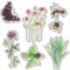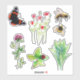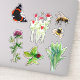 Nature wildflowers, bee, bumblebee, red admiral butterfly sticker. Beautiful handpainted watercolor originals. Original and natural themes for birthdays, decoration, greetings. Botanical paintings with Clover, lily of the valley, arctic raspberry, poppies.