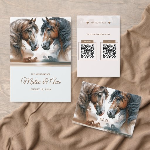 Create a custom photo wedding RSVP response card. The RSVP card is a great complement to the wedding stationery from the Beautiful Brown Horses Design collection. A minimalist design featuring beautiful artistic horses across the top of the card. Earth tone colours. The wedding RSVP card provides response information for your guests as well as three meal choice options. Customise the text on the front and back of the response card. Add your photo to the back. Add one photo. Use the template to create your own custom photo wedding RSVP card.