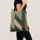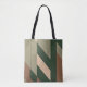 This tote bag boasts a bold, abstract design with sweeping diagonal lines in earthy shades of green, beige, and soft browns. The layered, angular shapes create a dynamic, almost chevron-like pattern that adds movement and flow to the design. The colour palette evokes natural elements, making it a stylish and versatile accessory perfect for everyday use. Its minimalist yet impactful design gives off a modern vibe while staying true to a nature-inspired theme, making it a subtle statement piece for casual outings.