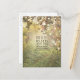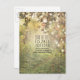 Vintage rustic country save the date postcard with forest trees path and hanging glowing string lights