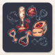 Cheeky square paper coasters featuring playful hand-drawn naughty dice, champagne glass with hearts, glossy lips, bows, and romantic symbols on deep navy background. Perfect for adult parties, bachelorette nights, Valentine's gatherings, spicy date nights or adding fun naughty humor to any cocktail hour.