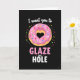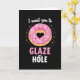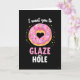 This funny greeting card features a glazed donut front and center, topped with bubblegum-pink frosting and scattered with colorful sprinkles in long and round shapes. The donut has a heart-shaped hole in the middle, giving the design a flirty, cheeky twist. Everything sits on a deep black background with tiny speckled dots that look a bit like stars. At the top, the card says “I want you to,” written in a smooth white script that feels romantic and teasing. At the bottom, it reads “GLAZE my HOLE” in uppercase block letters, with “GLAZE” in pink to match the frosting and “my HOLE” in white. The mix of sweet dessert imagery and suggestive wording makes it funny and a little risqué, perfect for someone who likes a naughty joke