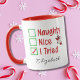 Naughty, Nice, I tried funny Santa hanging off of Christmas lights Holiday mug. Easily personalise with a name for a humourous Xmas gag gift. This would be a cute present for kids or adults.