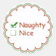 These funny Christmas stickers feature a l red and green text design: Naughty or Nice. The "Nice" version is available in the shop. Available in two different sizes.