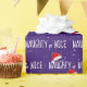 White NAUGHTY or NICE text with snowflakes and Santa Claus caps on purple background.