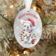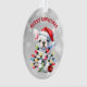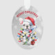 On this cute Holiday ornament, an adorable little white French Bulldog has been into the Christmas decorations! He is wrapped in lights, and ornaments lie at his feet. The dog wears a red and white Santa hat. The text above the image says "MERRY CHRISTMAS" in red. The image and text are placed on a silver abstract bokeh background. The back of the ornament has the same image, but with the text "HAPPY NEW YEAR" in green.
