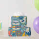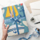 A lively pattern featuring nautical elements like sailboats, anchors, lifebuoys, seagulls, shells, compasses, and a charming lobster. Set against a teal background, this design captures the essence of seaside adventures with vibrant colours and playful imagery.