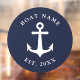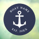 This round nautical window decal (window cling) is easy to personalise with the boat name, year, or another text. The design imitates a stamp and features a white anchor and text templates on a navy blue background. Smaller and larger sizes are available, please choose the best option for you before ordering.