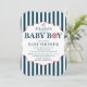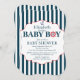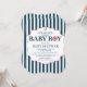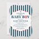 Cute nautical baby shower invitation for your baby boy shower. Our modern boy nautical baby shower invitation features a blue and white stripe background with an anchor and ships wheel. Flip our chic & stylish baby invite over to find a matching back for an extra special touch. Perfect for a nautical, sail boat, boat, boating, summer or beach theme baby shower