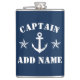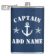 Nautical anchor custom boat captain name drink Flask. Maritime design with ship anchor and stars. Alcohol and drinking presents for sailor, boat captain, fisher, skipper, boss, coworker, colleague, dad, husband, uncle, grandpa, brother, coach, yacht owner etc. Cool Birthday, retirement and Christmas presents for men who love sailing and boating. Add your own spirit. Vinyl wrapped drinking flasks. Navy blue and white colours. Available in 6 and 8 ounce size.