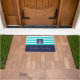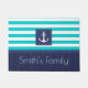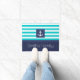 Nautical door mat with turquoise & navy blue striped pattern and customisable text.